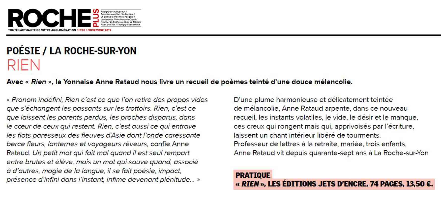 Originaire de la Nièvre aux confins du Cher (La Charité-sur-Loire, 1947), Anne Rataud vit en Vendée (La Roche-sur-Yon) depuis une cinquantaine d’années. Professeur de lettres, ateliers-théâtre, donneuse de voix à l’AVH, lectrice en milieu hospitalier, elle est actuellement « en retrait ».
