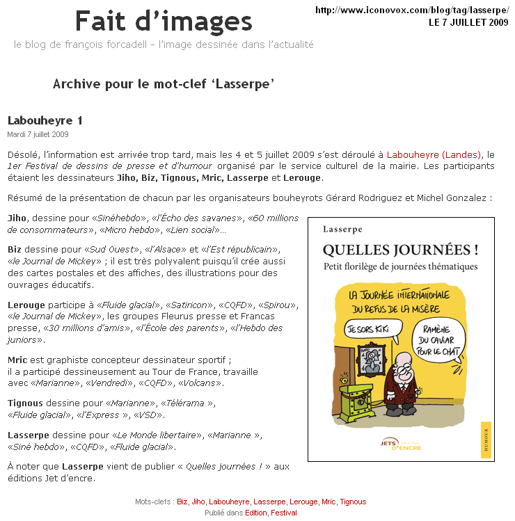 Gilles Lafitte, dit Lasserpe, est un dessinateur de presse aguerri. Ses premiers dessins ont été publiés dans "Le Monde libertaire" et "Barre à mine", puis "L’Humanité", "La Dépêche du Midi", "Politis", "Sud-Ouest", "L’Actu", "Fluide glacial"...
